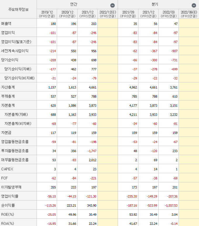 올해 1분기 매출액은 47억원, 영업손실은 97.4억원으로 전분기 대비 16% 정도 하락하였습니다. 다양한 장르의 게임 개발을 많이 하고 있긴하지만 이렇다할 주력 게임이 없기 때문에 매출 상승이 힘들어 보입니다.