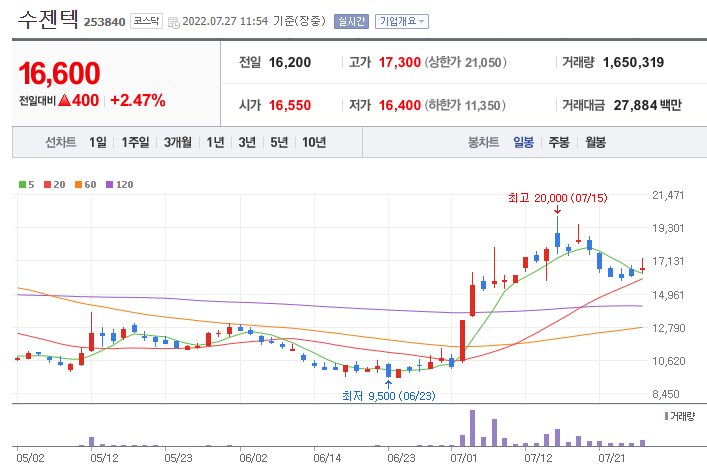 - 수젠텍은 BT/IT/NT 융합기술 기반 국내 유일의 Lab, POCT, 홈테스트 영역의 진단 플렛폼과 혁신적인 제품을 라인업하여 개발, 판매하는 체외진단 전문회사로 19년 5월 코넥스시장에서 코스닥시장으로 이전상장하였습니다.