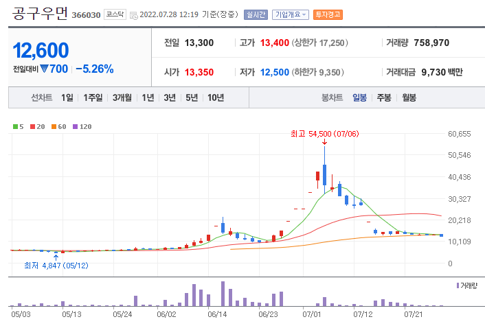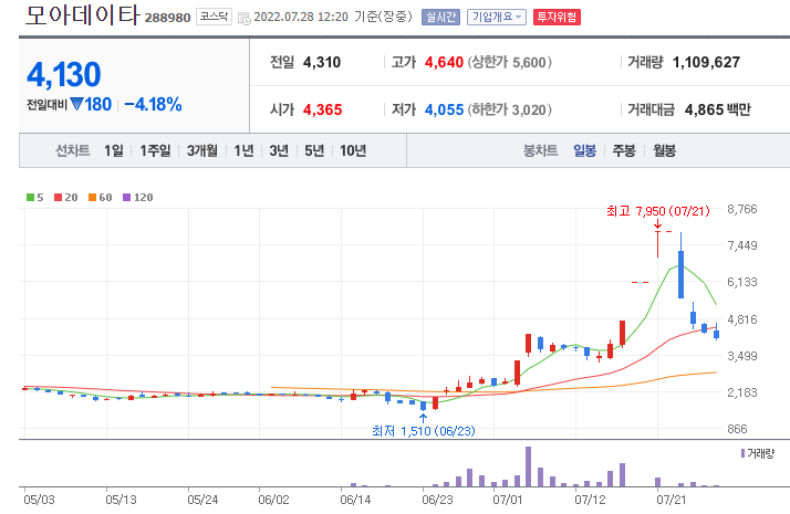 공구우먼과 모아데이타 역시 무상증자 결정 이후 상한가까지 주가가 치솟으며 현재는 다시 제자리로 돌아가고 있습니다.