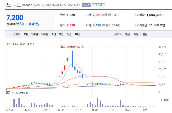 최근 대표적인 무상증자 테마주인 공구우먼, 모아데이타, 노터스 입니다. 노터스의 경우 무려 8번의 상한가를 기록하며 저점대비 10배의 상승을 보여주었습니다.