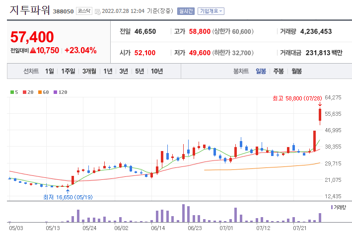 지투파워의 주가가 어제에 이어 오늘도 20% 넘는 상승세를 보여주고 있습니다. 지투파워는 지난 4월에 상장한 신규 상장 종목으로 상장 후 약 1달간 주가하락이 이어졌습니다. 그 이후 쭉 우상향을 하고 있는 종목인데요. 어제인 27일 1대4의 무상증자 결정으로 인해 거래정지 후 바로 상한가에 도달하였습니다.
