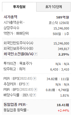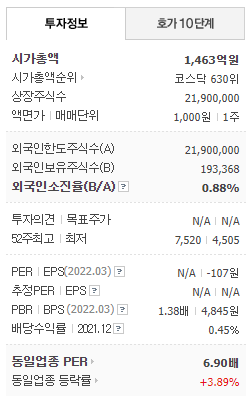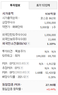 - 2022년 3월 전년동기 대비 별도기준 매출액은 16.9% 감소, 영업이익은 97.9% 감소, 당기순이익은 적자전환 되었습니다.