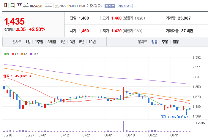 - 메디프론은 1997년 3월 설립되었으며, 2003년 1월 코스닥시장에 상장하였습니다.