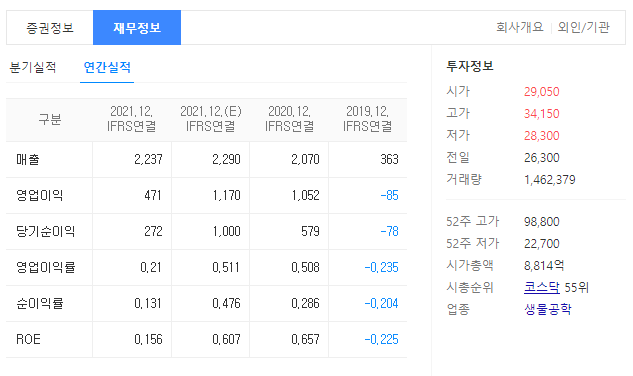바이오니아의 재무제표를 보시면 영업이익률이 매우 우수한 기업입니다. 매출액 대비 영업이익률과 당기순이익률이 20년도에는 50%를 기록했습니다. 수 많은 바이어 벤처 기업들이 적자에 허덕이는 것을 보면 바이오니아는 안정성이 뛰어난 바이오 기업으로 보여집니다.