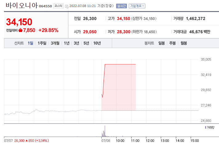 바이오니아가 장시작 몇 분만에 상한가까지 상승하게된 재료가 무엇인지 알아보겠습니다.