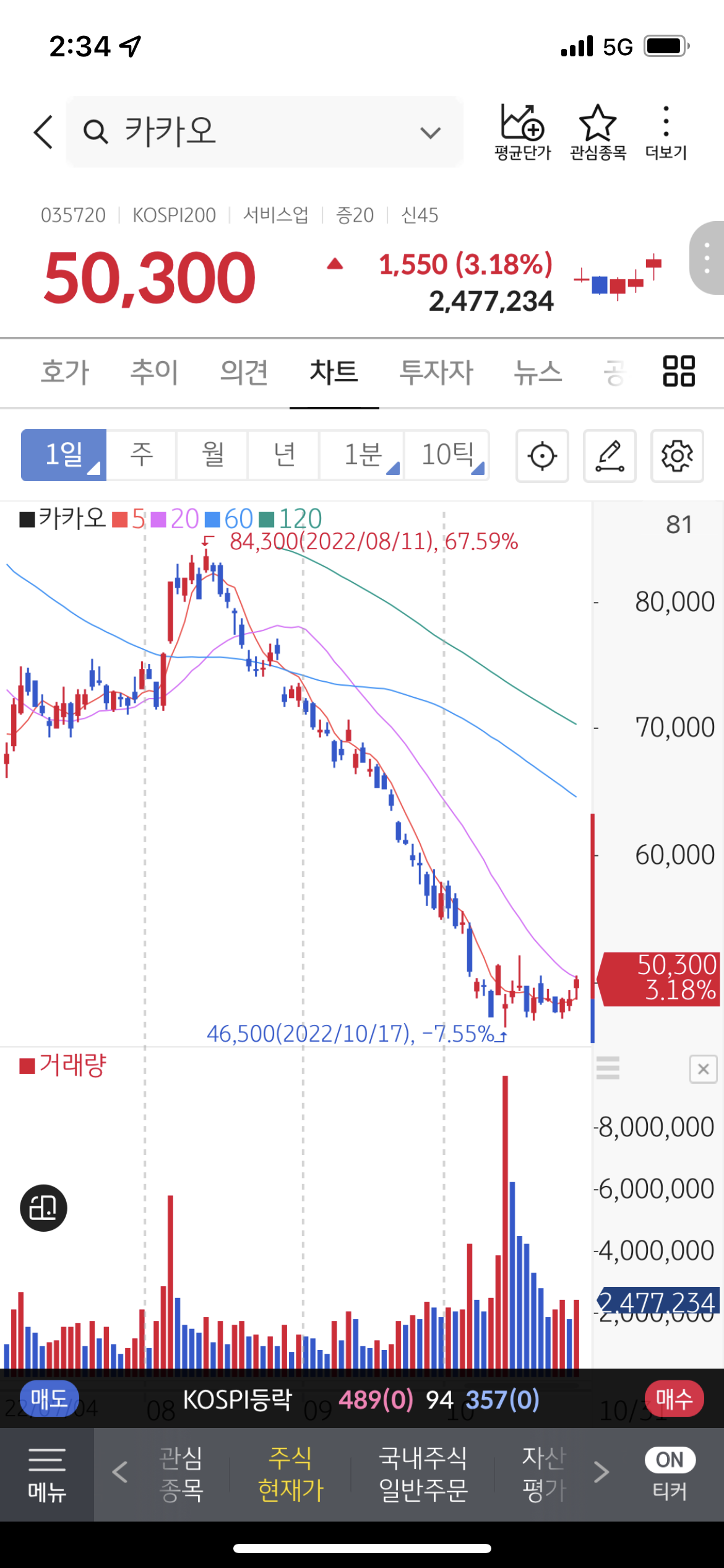 카카오의 현재 주가는 50,300원입니다. 카카오를 증권 어플에서 검색을 하게되면 현재 주가와 호가창을 볼 수 있습니다. 위에는 다양한 메뉴가 있는데요. 보통 차트, 투자자, 관련 뉴스, 종목토론, 재무제표 등을 확인할 수 있습니다.