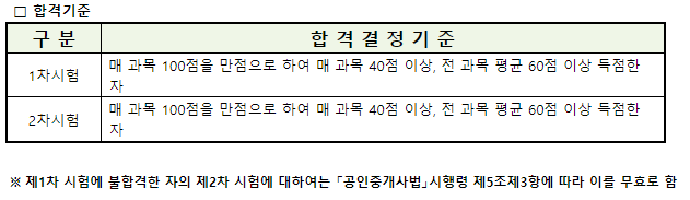 합격 기준은 여타 국가공인 시험과 같이 매 과목 40점 이상, 전 과목 평균 60점 이상 득점하여야 합니다. 절대 평가로 이루어지기 때문에 60점만 넘으면 합격할 수 있는 것입니다.
