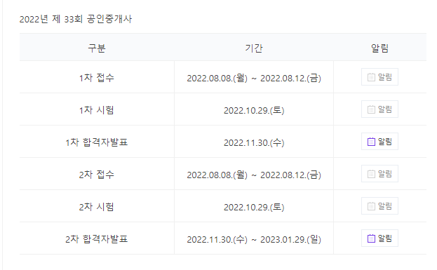 올해 치뤄졌던, 33회 공인중개사 시험일정을 보시면 시험접수는 8월 8일 ~ 8월 12일, 시험은 10월 29일, 합격자 발표는 11월 30일로 되어 있습니다.