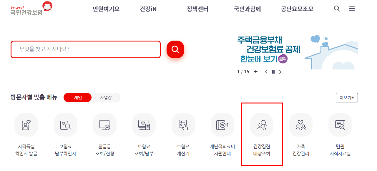 홈페이지에 들어가시면 메인 화면 왼쪽 빨간네모에 보이는 건강검진 대상 조회를 클릭해주세요.