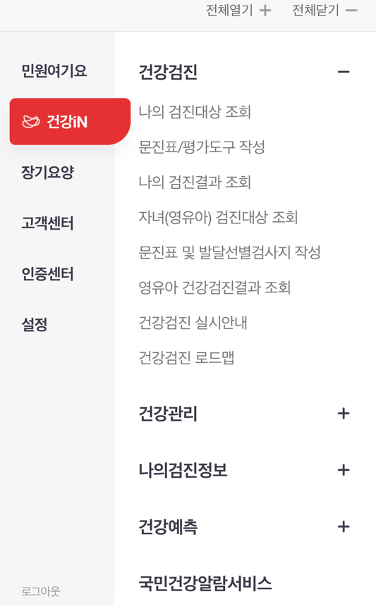 로그인 후 전체 메뉴에서 건강in >> 건강검진 >> 나의 검진대상 조회 순으로 클릭해주세요.