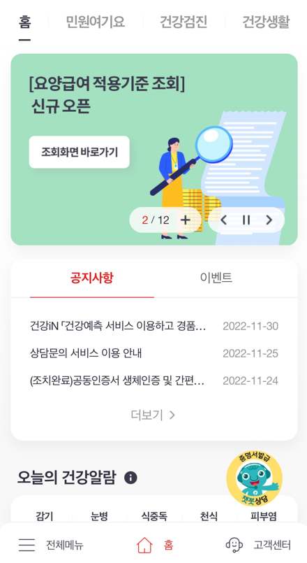 The건강보험 서비스는 공단 홈페이지내의 주요 콘텐츠를 국민들이 모바일에서 쉽고 빠르게 많은 정보를 접할 수 있도록 구성하였습니다.