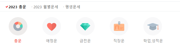 네이버 운세 메뉴에도 신년운세, 오늘의운세, 띠별 운세, 별자리 운세 등을 확인할 수 있으며, 신년운세에서 더 세부적으로 총운, 애정운, 금전운, 직장운, 학업, 성적운 등으로 나뉘어 운세를 볼 수 있습니다.