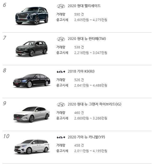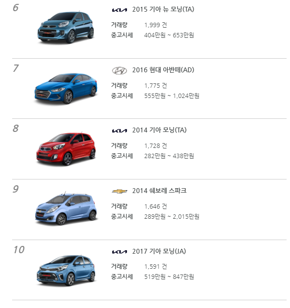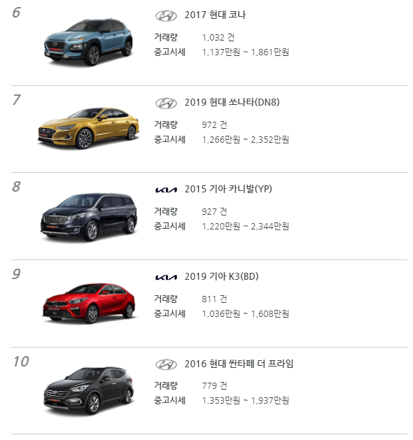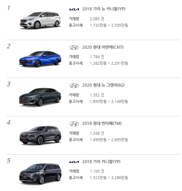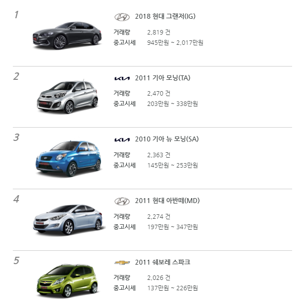 중고차 거래량이 높다는 것은 그만큼 자주 거래되고 매물도 많다는 의미이기 때문에 거래 순위가 높은 모델들은 다양한 가격대와 매물들을 비교해보고 구매할 수 있어, 보다 신중한 선택을 할 수 있게 도와줍니다.