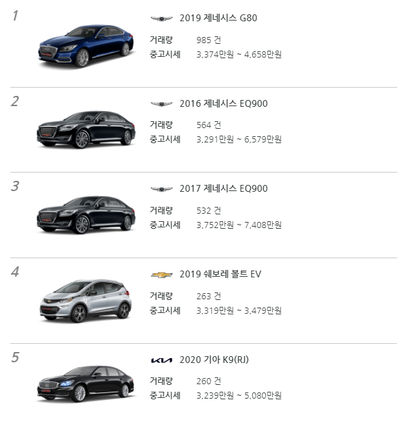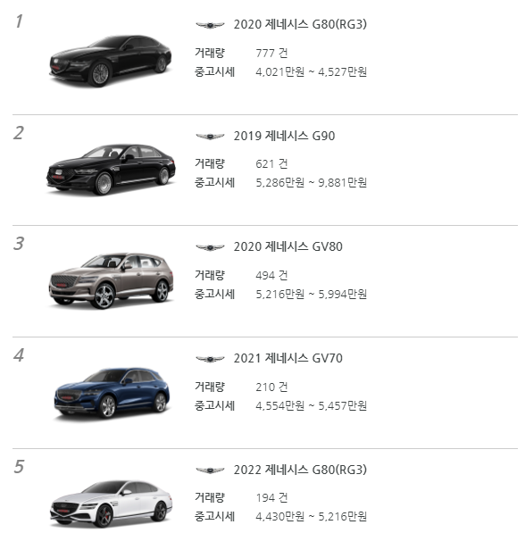 최신 연식의 신차급 중고차거나, 제네시스와 같은 비싼 모델들이 포함되어 있습니다. 순위를 보시면 제네시스 G80이 1위, 2위를 차지하고 있는 것을 볼 수 있습니다. 그 뒤로는 금액대가 높은 대형 SUV들이 순위를 이어가고 있습니다.