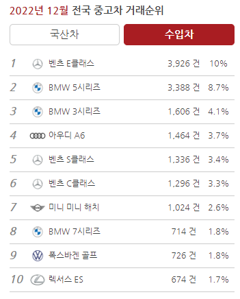 수입차 부동의 벤츠 E클래스가 거래량 1위를 차지했습니다. 그 뒤로 BMW의 5시리즈, 3시리즈 아우디 A6가 순위를 이루고 있습니다.