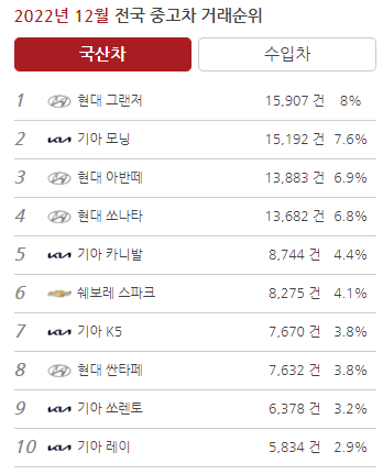 2022년 12월 집계된 전국 중고차 거래 순위입니다.