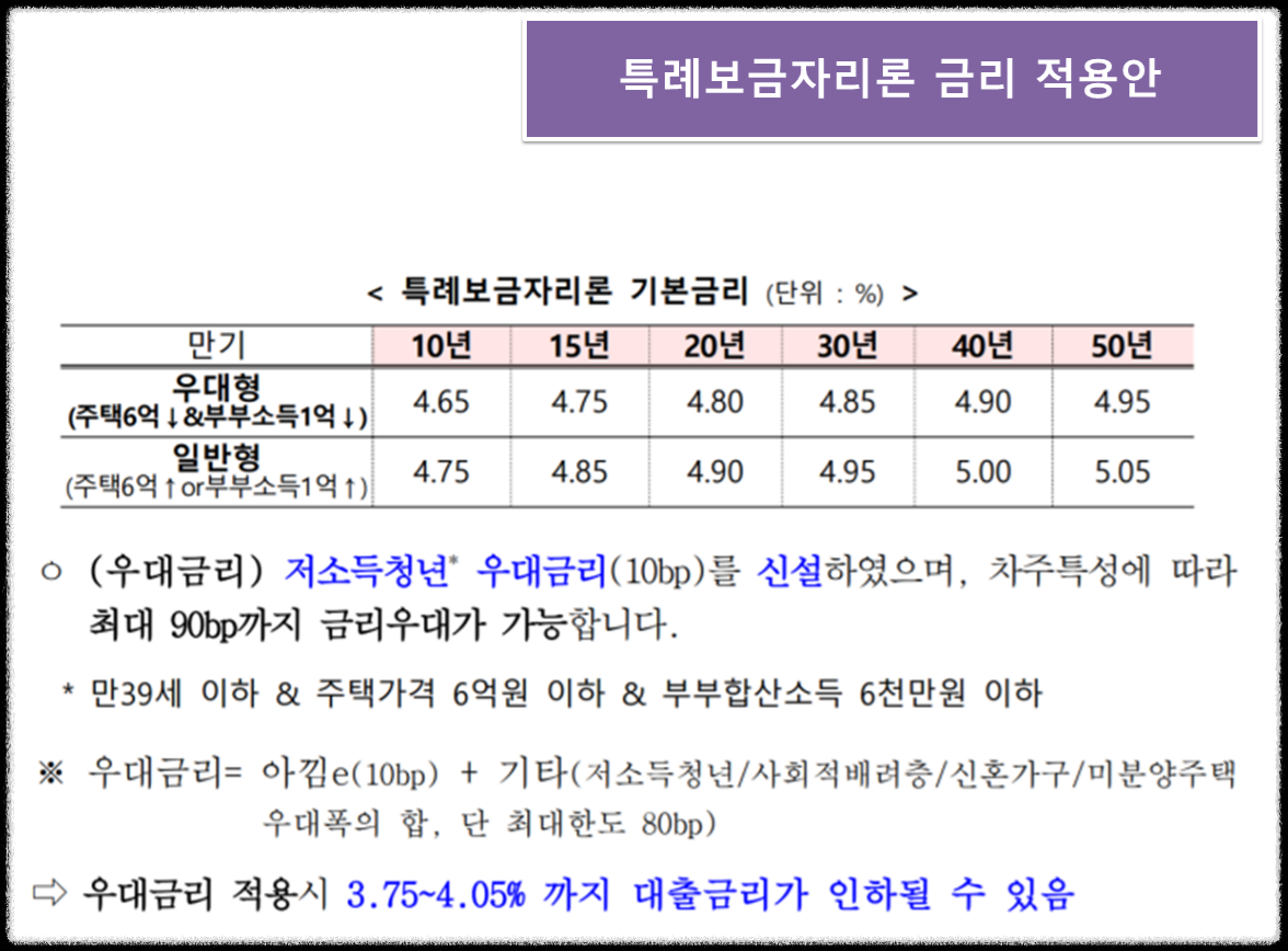 우대형과 일반형의 차이는 주택가격 6억원이하, 부부소득 1억 이하일 경우 우대에 쳐줍니다. 그 반대는 일반형에 속하구요. 우대금리를 받으려면 조건이 필요합니다. 저소득청년, 사회적배려층, 신혼가구, 미분양주택이 우대금리를 받을 수 있는 자격입니다.